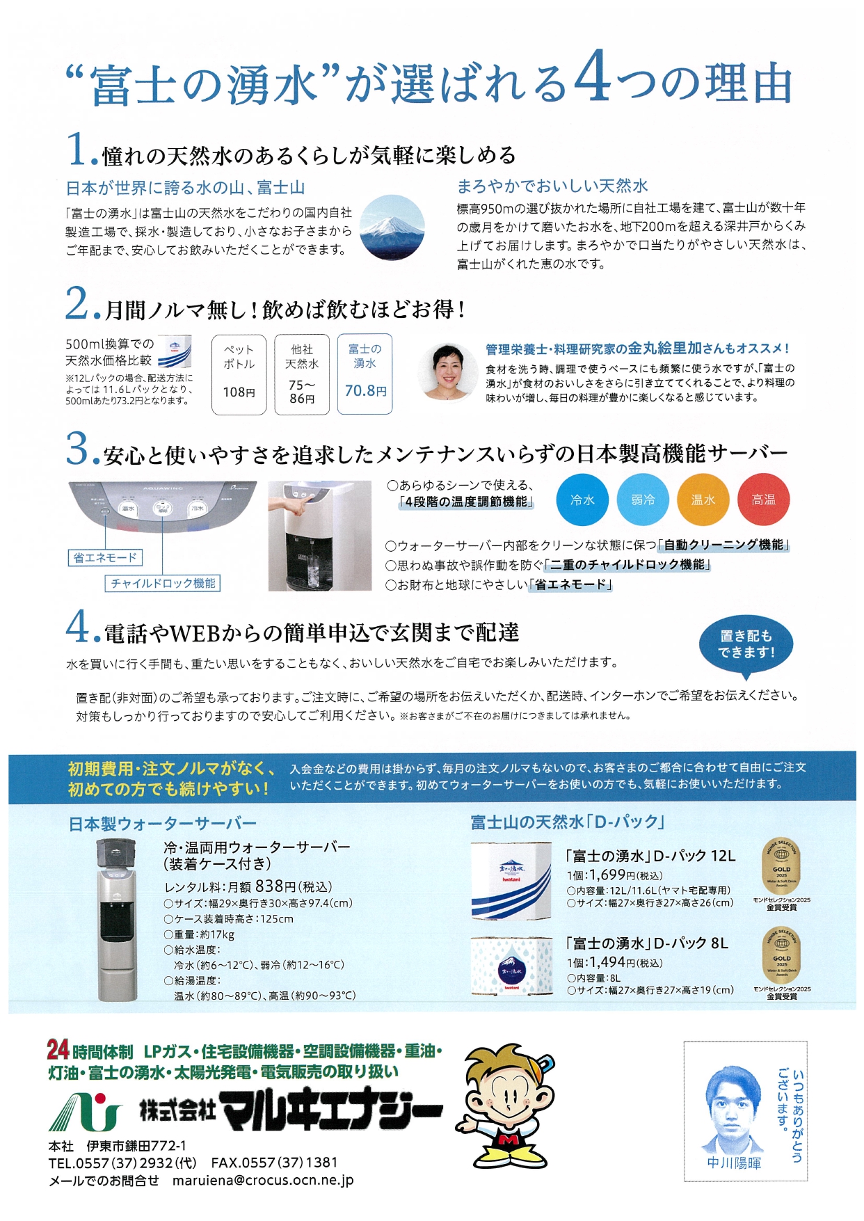 就職や進学、転勤などなど 新たに始まる新生活、ご自宅に「富士の湧水」ウォーターサーバーを設置して暮らしをもっと快適にしませんか?ウォーターサーバーがあれば、重たいお水を買いに行く必要がありません。冷水もお湯もすぐに使えるので、お湯を沸かす手間も、水を容器に移して冷蔵庫で冷やす手間も必要なくなります。
